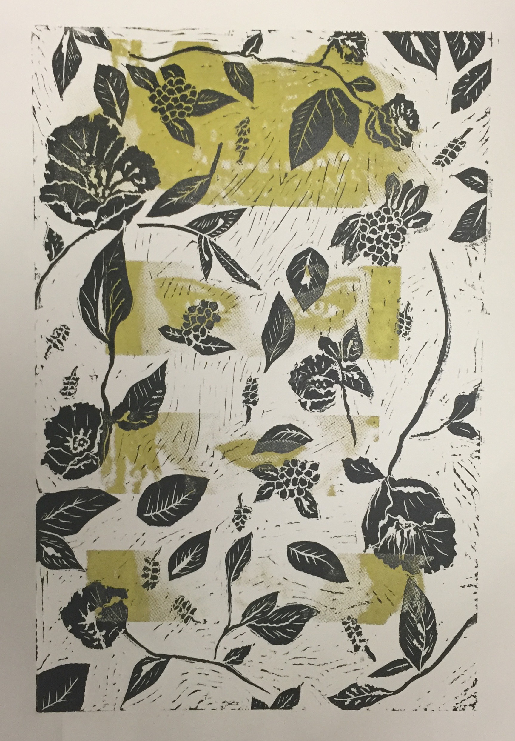 Relief (block-print) over Silk Screen print. Silk Screen was originally a watercolor portrait I had done prior. This piece was shown at Terrain 10 in 2017.